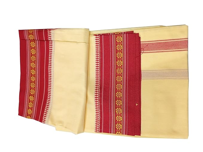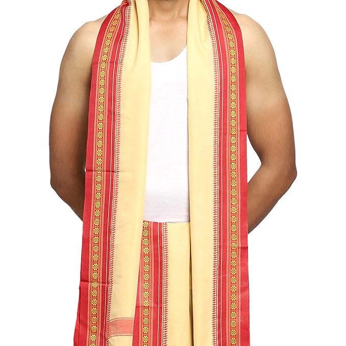 Cream-Beige Color Cotton Silk Dhoti for men, Soft & Comfortable Fabrics, Pooja Dhoti Set with Angwastram 9-5
